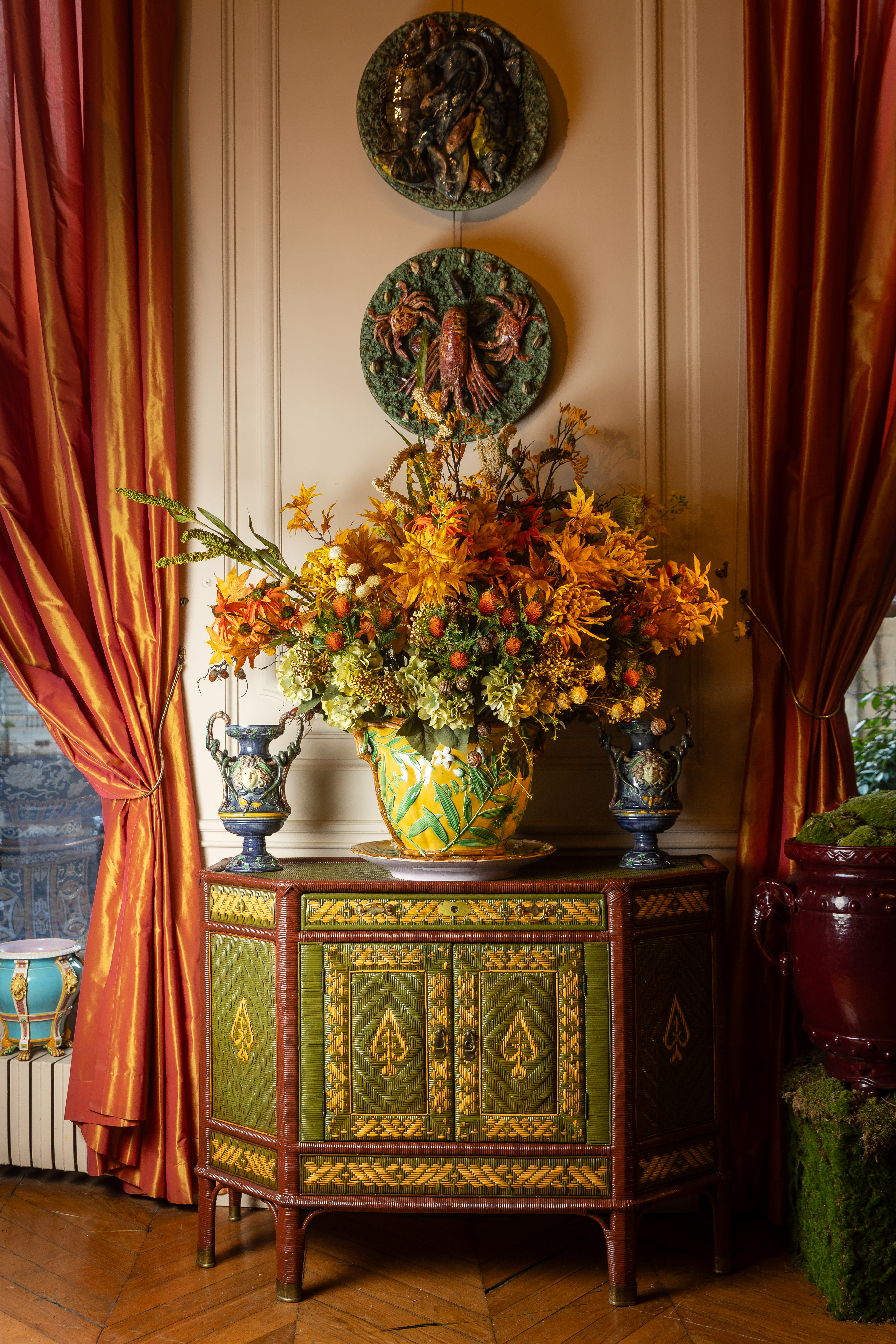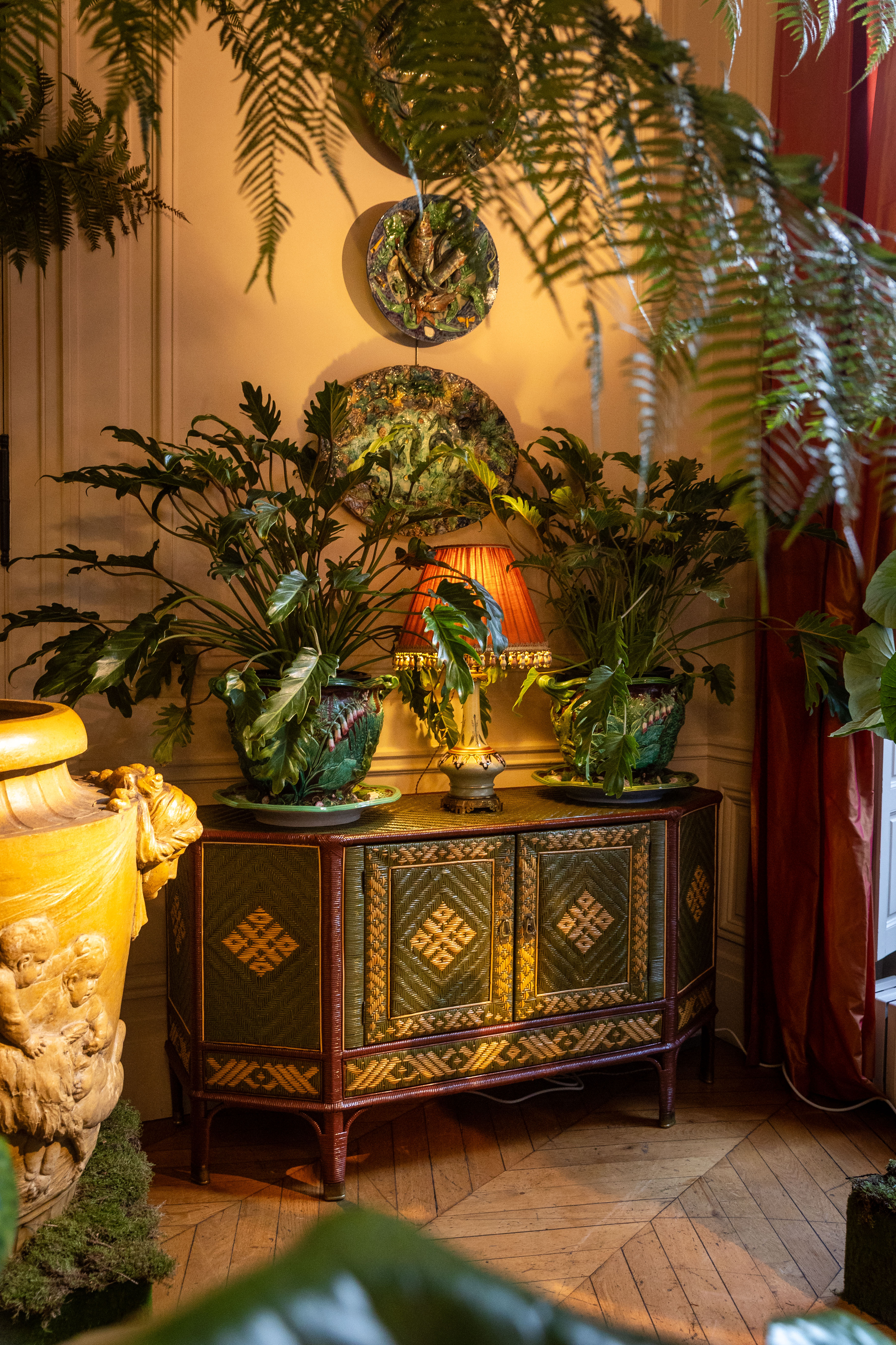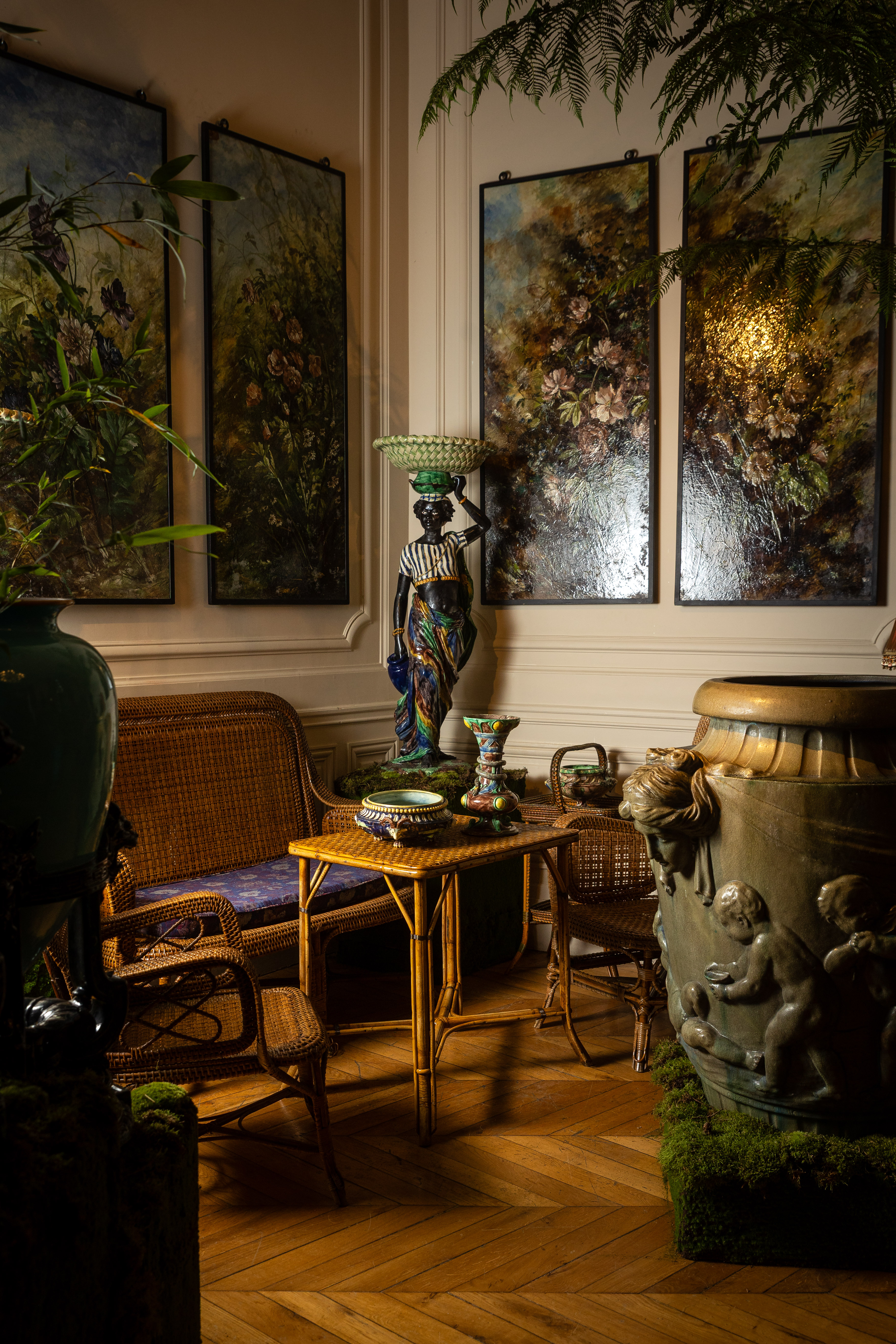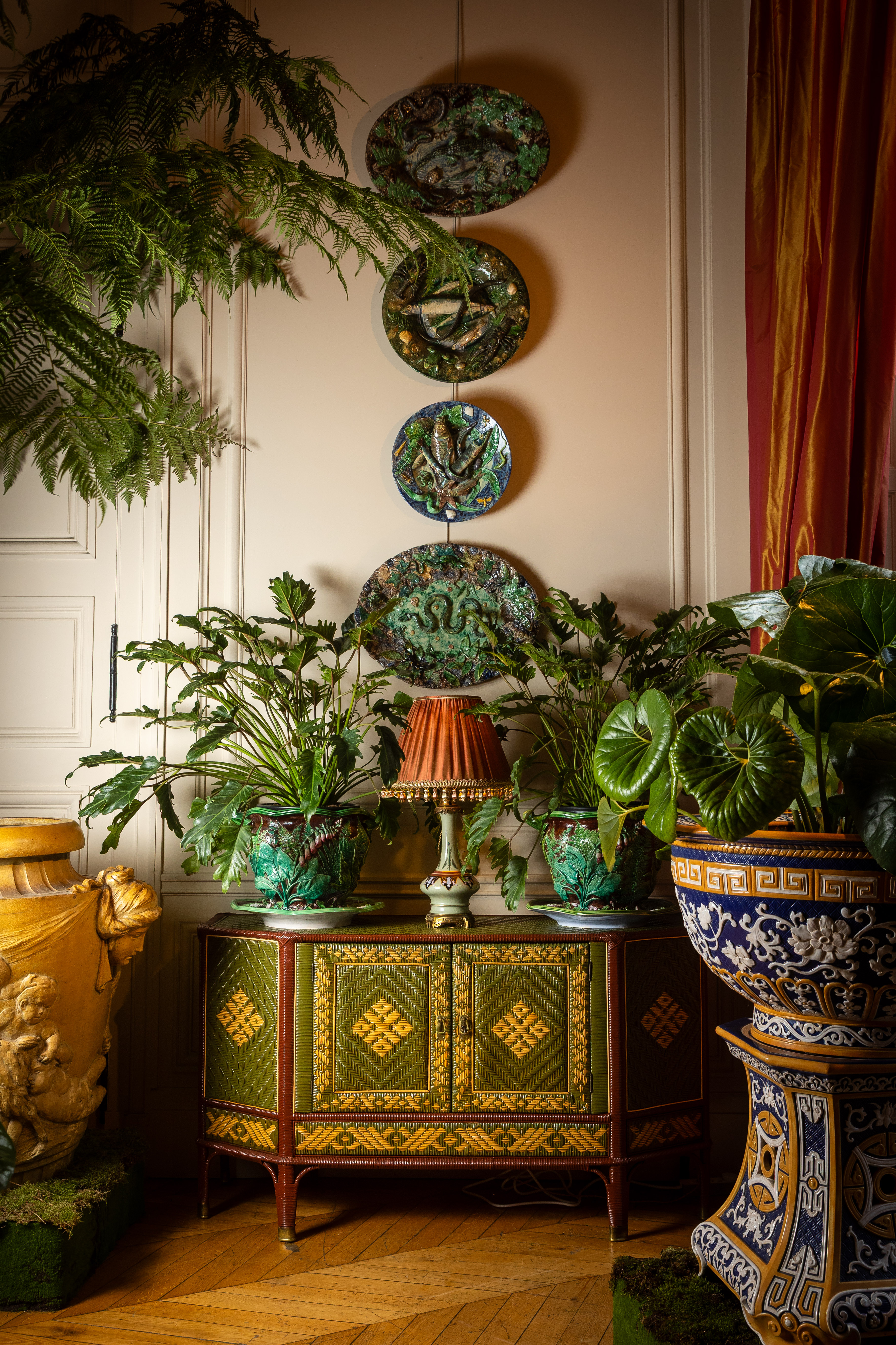Un ballet végétal se déploie : farfugiums, fougères arborescentes et feuillages délicats composent une partition subtile de textures, de teintes et de formes. Chaque espace devient une respiration, une parenthèse poétique où la céramique et le vivant s’entrelacent dans un même souffle. Les œuvres d’Émile Müller, des frères Avisseau, de Collinot ou encore de Massier trouvent ainsi écho dans un décor où le végétal devient matière poétique.